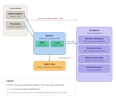 Le schéma ci-dessous présente l'architecture d'un bastion informatique : flux autorisés, accès bloqués et interconnexions avec le SIEM.